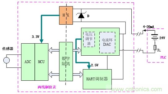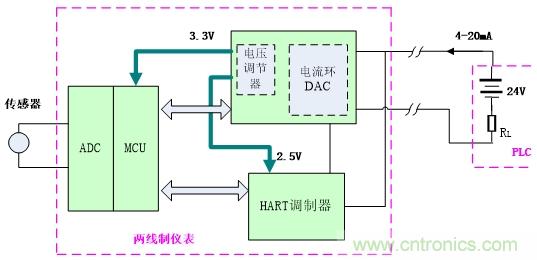 圖一的電路中,傳感器的信號經過ADC轉換成數(shù)字信號,再經MCU發(fā)送給電流環(huán)DAC及HART調制器,形成4-20mA的信號輸出,電流環(huán)DAC從PLC輸出的4-20mA總線上取電,經內置的電壓調節(jié)器輸出3.3V及2.5V,給MCU及HART調制器提供少量的電源。