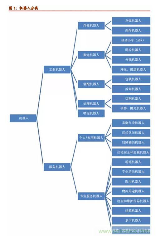 機(jī)器人專家從機(jī)器人應(yīng)用環(huán)境出發(fā),將機(jī)器人分為兩大類,即工業(yè)機(jī)器人和服務(wù)機(jī)器人。工業(yè)機(jī)器人根據(jù)用途不同,大致可以分為焊接機(jī)器人、搬運(yùn)機(jī)器人、噴漆機(jī)器人、涂膠機(jī)器人、裝配機(jī)器人、碼垛機(jī)器人、切割機(jī)器人、自動(dòng)牽引車(AGV)機(jī)器人、凈室機(jī)器人等。而服務(wù)機(jī)器人則是除工業(yè)機(jī)器人之外的、用于非制造業(yè)并服務(wù)于人類的各種先進(jìn)機(jī)器人,主要包括個(gè)人/家用服務(wù)機(jī)器人和專業(yè)服務(wù)機(jī)器人。其中,個(gè)人/家用機(jī)器人主要包括:家庭作業(yè)機(jī)器人、娛樂(lè)休閑機(jī)器人、殘障輔助機(jī)器人、住宅安全和監(jiān)視機(jī)器人等;專業(yè)服務(wù)機(jī)器人主要包括:場(chǎng)地機(jī)器人、專業(yè)清潔機(jī)器人、醫(yī)用機(jī)器人、物流用途機(jī)器人、檢查和維護(hù)保養(yǎng)機(jī)器人、建筑機(jī)器人、水下機(jī)器人,以及國(guó)防、營(yíng)救和安全應(yīng)用機(jī)器人等等。