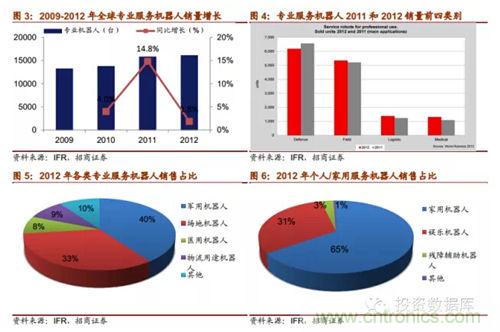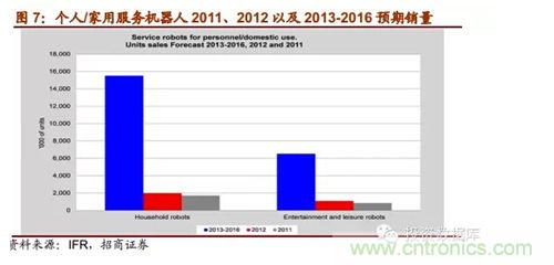 IFR報(bào)告預(yù)期,從2013年到2016年,全球工業(yè)機(jī)器人市場(chǎng)將以年均6%的速度增長(zhǎng),中國(guó)是這一增長(zhǎng)趨勢(shì)的領(lǐng)跑者,年均增長(zhǎng)率達(dá)15%。根據(jù)marketsandmarkets的報(bào)告,2011年全球服務(wù)機(jī)器人市場(chǎng)規(guī)模為183.9億美元,到2012年增長(zhǎng)到207.3億美元,計(jì)2012-2017年全球服務(wù)機(jī)器人市場(chǎng)規(guī)模復(fù)合增速將達(dá)到17.4%,到2017年達(dá)到461.8億美元。對(duì)于專業(yè)服務(wù)機(jī)器,IFR預(yù)測(cè)2013-2016年估計(jì)有94800臺(tái)專業(yè)服務(wù)機(jī)器人會(huì)得到安裝使用,銷售額達(dá)171億美元。其中軍用機(jī)器人銷量約達(dá)28000臺(tái);場(chǎng)地機(jī)器人中的擠奶機(jī)器人銷量估計(jì)為24500臺(tái)。兩者占總專業(yè)服務(wù)機(jī)器人銷量55%。