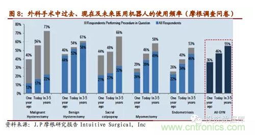 雖然當(dāng)前醫(yī)用機(jī)器人普及率還很低,并且安裝的大部分是發(fā)達(dá)國(guó)家,但摩根的近期的一個(gè)調(diào)查研究中問(wèn)及外科醫(yī)生們未來(lái)他們會(huì)在自己在手術(shù)中多高頻率的使用醫(yī)用機(jī)器人,數(shù)據(jù)表明美國(guó)的外科醫(yī)生們認(rèn)為未來(lái)3-5年里醫(yī)用機(jī)器人在手術(shù)中的使用率會(huì)迅速上升到一個(gè)比較高的層次,約占50%,醫(yī)用機(jī)器人市場(chǎng)潛力巨大。IFR預(yù)測(cè)在未來(lái)的4年里,醫(yī)療機(jī)器會(huì)以每年19%的速度增長(zhǎng),2016年全球市場(chǎng)規(guī)模估計(jì)會(huì)增長(zhǎng)到119億美元。