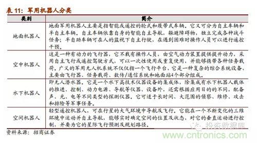 (五)軍事機(jī)器人是21世紀(jì)各國(guó)軍事安全重點(diǎn)戰(zhàn)略:蒂爾集團(tuán)稱未來(lái)10年全球無(wú)人機(jī)研發(fā)投入和采購(gòu)需求將達(dá)到940億美元。軍用機(jī)器人強(qiáng)國(guó)包括美德英法意以日韓,這些國(guó)家不僅在技術(shù)處于研究的先列,其產(chǎn)品已經(jīng)在軍事上有了實(shí)際運(yùn)用;我國(guó)與這些強(qiáng)國(guó)的技術(shù)差距明顯,受政策支持,軍事機(jī)器人相關(guān)企業(yè)發(fā)展前景明顯良好,可能成為企業(yè)未來(lái)強(qiáng)勁的收入保證。