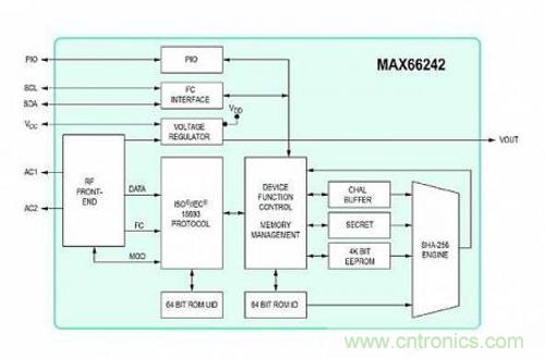 幾種功能對(duì)于無線NFC/RFID應(yīng)用非常重要:集成到無源標(biāo)簽認(rèn)證器的高級(jí)安全性(圖2)、集成無線NFC/RFID接口和I?C接口、數(shù)據(jù)保護(hù)模式、高速數(shù)據(jù)傳輸、標(biāo)簽?zāi)芰渴占籑AX66242集成了SHA-256加密引擎,提供基于安全密鑰的對(duì)稱式質(zhì)詢-應(yīng)答安全認(rèn)證。是控制NFC/RFID讀卡器與那些設(shè)備通信,以及如何與MAX66242通信的最好途徑。32字節(jié)SRAM緩存器有利于通過I?C接口進(jìn)行高速數(shù)據(jù)傳輸。標(biāo)簽上的能量收集引腳VOUT使其利用天線從讀卡器的HF場收集能量。