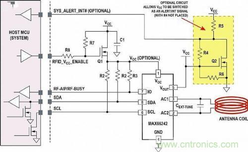 圖4中,I?C接口(SDL和SDA)和PIO信號(hào)(RF-AIP和RF-BUSY功能的多路復(fù)用線)是連接主機(jī)微控制器所必須的,RFID_VCC_ANABLE和SYS_ALERT_INT#信號(hào)可選。MOSFET Q1用于隔離。由于可通過RF和I?C接口訪問標(biāo)簽內(nèi)部的EEPROM,當(dāng)主機(jī)微控制器必須在存在HF場的情況下進(jìn)行連接時(shí),Q1為標(biāo)簽供電。然而,可選的Q2利用電路板上的穩(wěn)壓VCC切換開漏SYS_ALERT_INT# (這種情況下不安裝R4)。