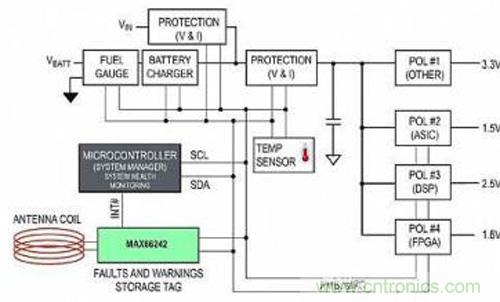 設(shè)計(jì)者可利用MAX66242儲(chǔ)存對(duì)系統(tǒng)運(yùn)行至關(guān)重要的診斷和故障數(shù)據(jù)。在系統(tǒng)“死機(jī)”后或未上電時(shí),可上傳該數(shù)據(jù)。這種系統(tǒng)健康和故障數(shù)據(jù)的收集是通過NFC/RFID標(biāo)簽的接口實(shí)現(xiàn)的。圖7所示為典型的電源管理系統(tǒng),其中每個(gè)負(fù)載點(diǎn)(POL)穩(wěn)壓器由公共電源管理總線(PMBus)進(jìn)行配置和監(jiān)測。PMBus僅僅是I?C總線的一種變體。系統(tǒng)正常工作期間,持續(xù)監(jiān)測每個(gè)POL的關(guān)鍵工作參數(shù)。在持續(xù)監(jiān)測模式下,系統(tǒng)管理器也可執(zhí)行修正措施,以響應(yīng)故障或工作報(bào)警。