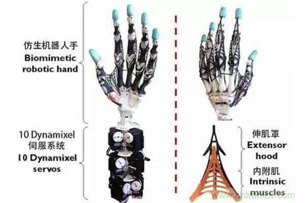 「擬人機(jī)器手設(shè)計(jì)的常規(guī)方法是,用類似鉸鏈、聯(lián)動(dòng)裝置和平衡環(huán)等零件來實(shí)現(xiàn)生物部件的機(jī)械化,從而將看似復(fù)雜的人體參照物進(jìn)行了簡化。這種方法對于理解并模仿人手的運(yùn)動(dòng)原理有一定幫助,但不可避免的制造了一些人與機(jī)械手之間的不良差異,因?yàn)槿耸稚洗蠖鄶?shù)顯著的生物力學(xué)特征都在機(jī)械化的過程中被丟棄了。這些機(jī)器手和人手生物力學(xué)在本質(zhì)上的不匹配阻礙了我們使用自然的手部運(yùn)動(dòng)來直接控制它們。因此,還沒有任何一只擬人機(jī)器人手可以達(dá)到人手的靈巧程度。」