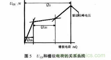 柵極電荷QG包含了兩個部分:柵極到源極電荷QGS;柵極到漏極電荷QGD—即“Miller”電荷。QGS是使柵極電壓從0升到門限值(約3V)所需電荷;QGD是漏極電壓下降時克服“Miller”效應(yīng)所需電荷,這存在于UGS曲線比較平坦的第二段(如圖5所示),此時柵極電壓不變、柵極電荷積聚而漏極電壓急聚下降,也就是在這時候需要驅(qū)動尖峰電流限制,這由芯片內(nèi)部完成或外接電阻完成。實際的QG還可以略大,以減小等效RON,但是太大也無益,所以10V到12V的驅(qū)動電壓是比較合理的。這還包含一個重要的事實:需要一個高的尖峰電流以減小MOS管損耗和轉(zhuǎn)換時間。