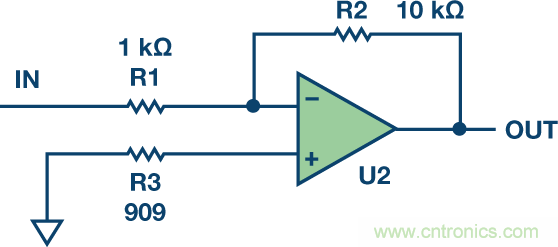 在同相接地輸入端增加一個與輸入電阻R1和反饋電阻R2的并聯組合相等的電阻(圖1中的R3),可以讓阻抗相等。做一些計算可以證明,誤差降至Ioffset × R feedback 。由于I offset 為I bias 的10%到20%,所以這會有助于降低輸出失調誤差。