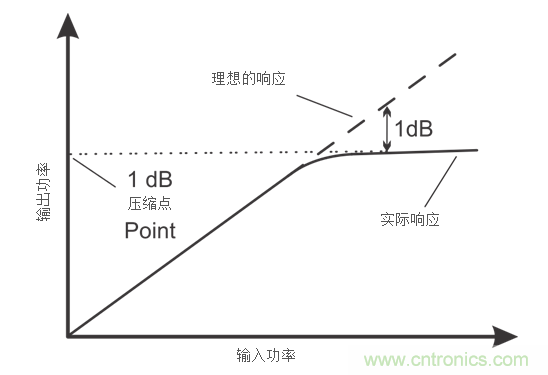 第二種規(guī)格,輸出1dB壓縮點,實際上非常類似于最大線性輸出電壓和電流的概念。它也被稱為P1dB,在該點上,放大器從理想狀態(tài)下增益壓縮到1分貝的輸出功率級。圖1介紹了該概念,其中,實線表示測得的信號,虛線表示理想的信號。有時,一些測量將P1dB點與輸入而非輸出對照,這應在計算中予以考慮。