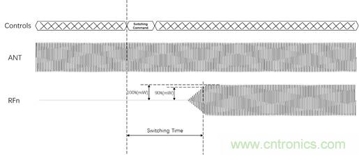 開關時間(Switch Time)或切換時間指的是開關從“導通”狀態(tài)轉變?yōu)?ldquo;截止”狀態(tài)或者從“截止”狀態(tài)轉變?yōu)?ldquo;導通”狀態(tài)所需要的時間。具體來講是指從DUT接收到通道切換命令,到在被切換到的通道上信號的功率達到滿幅度值的90%的時間。