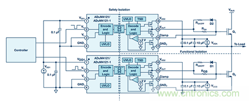 圖6. 采用ADuM4121隔離式柵極驅(qū)動(dòng)器的半橋設(shè)置中的隔離柵
