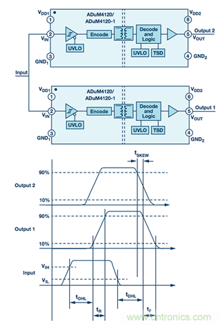 如圖5所示,傳播延遲偏斜被定義為器件間偏差。對(duì)于具有多個(gè)輸出通道的器件,此規(guī)格的表述方式相同,但被稱(chēng)為通道間偏斜。傳播延遲偏斜通常不能在控制電路中予以補(bǔ)償。
