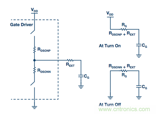 RDS(ON)是柵極驅(qū)動(dòng)器最大驅(qū)動(dòng)強(qiáng)度額定值的真正基礎(chǔ),因?yàn)樗拗屏蓑?qū)動(dòng)器可以提供的柵極電流。內(nèi)部開(kāi)關(guān)的RDS(ON)決定灌電流和拉電流,但外部串聯(lián)電阻用于降低驅(qū)動(dòng)電流,因此會(huì)影響邊沿速