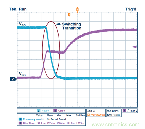 圖2. 無(wú)柵極驅(qū)動(dòng)器的MOSFET導(dǎo)通轉(zhuǎn)換