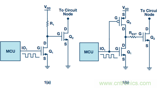 考慮一個(gè)具有微控制器的數(shù)字邏輯系統(tǒng),其I/O引腳之一上可以輸出一個(gè)0 V至5 V的PWM信號(hào)。這種PWM將不足以使電源系統(tǒng)中使用的功率器件完全導(dǎo)通,因?yàn)楣β势骷尿?qū)動(dòng)電壓一般超過(guò)標(biāo)準(zhǔn)CMOS/TTL邏輯電壓。因此,邏輯/控制電路和高功率器件之間需要一個(gè)接口。這可以通過(guò)驅(qū)動(dòng)一個(gè)邏輯電平n溝道MOSFET,其進(jìn)而驅(qū)動(dòng)一個(gè)功率MOSFET來(lái)實(shí)現(xiàn),如圖1a所示。