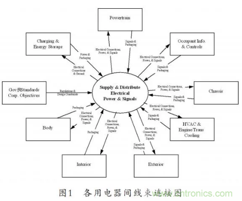 線束是汽車的神經(jīng)網(wǎng)絡(luò)系統(tǒng),在整車的運行中傳遞電壓、信號及大量的數(shù)據(jù),圖1為各用電器線束連接示意圖。特別是在互聯(lián)網(wǎng)、大數(shù)據(jù)背景下,這就要求線束載體不僅僅起到通斷作用,對數(shù)據(jù)的傳輸速率及響應能力提出了更高的要求,同時由于線束的物理布置空間有限,對其失效性和售后返修帶來更大挑戰(zhàn)。