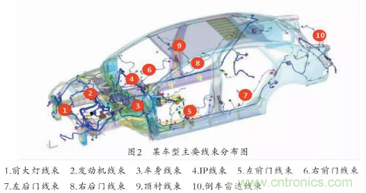 隨著車輛安全、智能、舒適性的發(fā)展,傳感器、攝像頭及ECU占據(jù)了一定的空間,從而造成線束的布置空間越發(fā)狹小,同時功能的增加意味著導線數(shù)量及體積不斷增大。整車可裝拆性、運輸便利性等也對線束提出了更高的要求。下圖2 是上汽通用某車型的線束發(fā)布圖, 為便于運輸和裝配,將整車線束切割成11個部分。