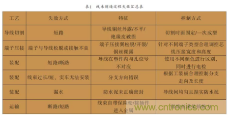 如下表1是線束在制造過程中最常見的失效方式,需在制造的各個環(huán)節(jié)保證線束的制造質(zhì) 量。機械設(shè)備設(shè)定合理的規(guī)格參數(shù),人工操作建立標準化操作及比對面板,最后對線束進行抽查全方位檢測而保證線束的制造質(zhì)量。