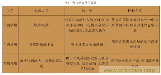 耐久性失效是一種隨著車輛使用,在中間環(huán)節(jié)形成的失效方式,是伴隨著車輛的生命周期隨機產(chǎn)生的,具有不可預測性。一旦失效會引起客戶對品牌的極大抱怨。此類失效多為線束在運動件包絡(luò)區(qū)域內(nèi)發(fā)生,在達到一定的磨損后產(chǎn)生的,因此在初期不易察覺。如下表3為耐久性失效匯總表。