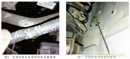 如下為兩種典型失效方式,圖6為發(fā)動機線束與空調(diào)補液管之間震動接觸造成的磨損,圖7為車輛輪速傳感器在運動到極限位置時悶頭受力后脫落。綜上需嚴格控制線束在運動包絡(luò)區(qū)域的布置,同時針對線束的磨損需遵循嚴格的評估標準。