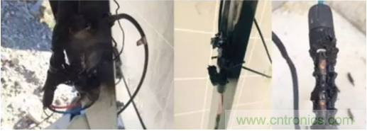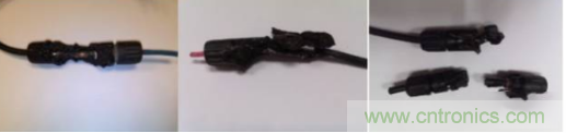 而在失效的樣品中就有兩個是用了不同的電纜,且外徑相差懸殊。圖11 中的左側圖連接器一側用的是光伏電纜(黑色),外徑為6mm,而另一側則是用的 普通線纜(藍色),外徑僅為4mm。將藍色電纜端的螺帽擰開后發現可能由于密封不夠竟采用了紅色塑料片填充。在該種情況下連接器是很難保證其密封性,因此,在戶外應用時有可能會進水進塵,從而破壞絕緣性能,進而引發火災。