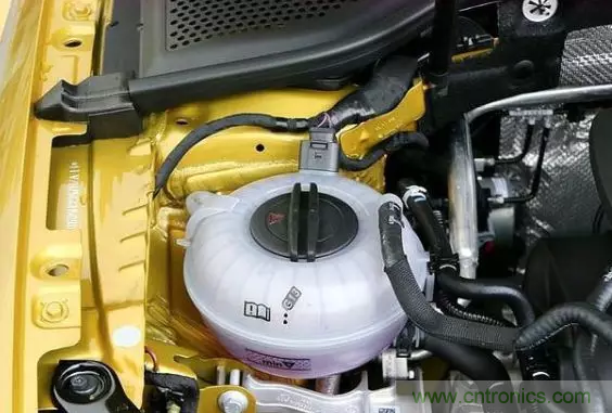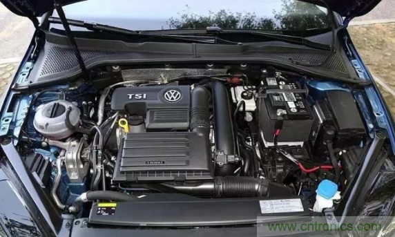 打開高爾夫的機艙蓋,發現機艙里面的管路,線束顯得有點零亂。
