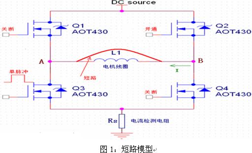 短路模型如圖1所示,其中僅畫出了功率輸出級的A、B兩相(共三相)。Q1和Q3為A相MOSFET,Q2和Q4為B相MOSFET,所有功率MOSFET均為AOT430。L1為電機線圈,Rs為電流檢測電阻。