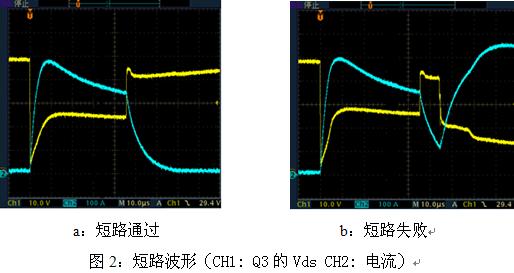 當控制器工作時,如電機短路,則會形成如圖1中所示的流經Q2,Q3的短路電流,其電流值很大,達幾百安培,MOSFET的瞬態溫升很大,這種情況下應及時保護,否則會使MOSFET結點溫度過高而使MOSFET損壞。短路時Q3電壓和電流波形如圖2所示。圖2a中的MOSFET能承受45us的大電流短路,而圖2b中的MOSFET不能承受45us的大電流短路,當脈沖45us關斷后,Vds回升,由于溫度過高,僅經過10us的時間MOSFET便短路,Vds迅速下降,短路電流迅速上升。由圖2我們可以看出短路時峰值電流達500A,這是由于短路時MOSFET直接將電源正負極短路,回路阻抗是導線,PCB走線及MOSFET的Rds(on)之和,其數值很小,一般為幾十毫歐至幾百毫歐。