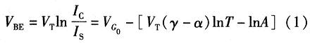 式中VG為帶隙電壓,γ和α為器件參數,A代表了那些方程推到過程中與溫度無關的常量。因為Vt=kt/q,可以得到VBE隨溫度上升是降低的。其關于溫度變化的方程為