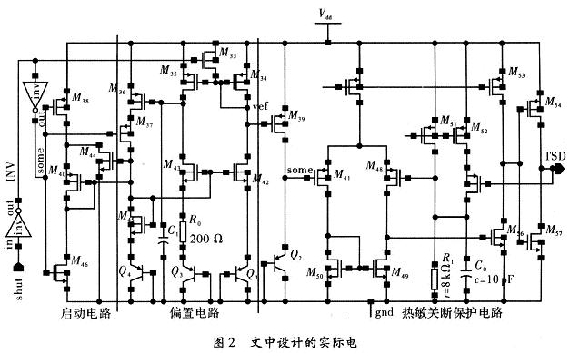 熱敏關斷保護電路:由于基準電路輸出的偏置電壓加到M39、M51、M52柵極上,所以在這兩條支路上都會產生PTAT電流。采用M41、M47、M48、M49、M50構成的兩級比較器來實現原理等效圖中Comp的功能。此比較器的第一級為PMOS差動輸入。