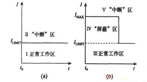 當負載電流超過限制電流ILIMIT 不太多且持續(xù)作用時間不太長時,我們希望過流保護電路能保持LDO 不中斷工作,因此需要采用“屏蔽”模式屏蔽掉部分可以讓LDO 不中斷運行的過流信號,對于過流幅值和持續(xù)作用時間超過范圍的過流信號,過流保護電路又能采取中斷LDO 工作的模式。傳統(tǒng)的“中斷”模式電流保護電路工作狀態(tài)如圖1(a)所示,分為正常工作區(qū)Ⅰ和“中斷”區(qū)Ⅱ,當負載電流不超過ILIMIT 時,LDO 工作在正常工作區(qū),當負載電流超過ILIMIT 時LDO 進入“中斷”區(qū)。加入“屏蔽”模式后的過流保護電路工作狀態(tài)如圖1(b),分為正常工作區(qū)Ⅲ、屏蔽區(qū)Ⅳ以及中斷區(qū)Ⅴ,當負載電流小于ILIMIT 時,LDO 處于正常工作區(qū),當過流信號的幅值在ILIMIT 和最大幅值電流IMAX 之間,持續(xù)作用時間在t=tMAX 之內即同時滿足ILIMIT ≤ ILOAD ≤ IMAX,t ≤tMAX 時,LDO 進入屏蔽區(qū),這個范圍之外的過流信號將進入中斷區(qū)。對比圖1(a)和(b)可以看出,改進過流保護電路后的LDO 的正常工作區(qū)包括圖1(b)的正常工作區(qū)Ⅲ和“屏蔽”區(qū)Ⅳ,增大了工作區(qū)的范圍,提高了LDO 的工作效率。
