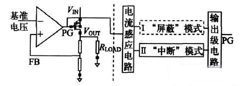包含過流保護電路的LDO整體框圖如圖2所示,虛線左邊是LDO 主體電路,包括誤差放大器、功率管、負載電阻以及分壓電阻。虛線右邊部分為電流保護電路,主要作用是感應并檢測負載電流是否超過限制電流,然后通過控制功率管來決定是否使LDO 中斷運行,包括電流感應電路和控制電路。傳統(tǒng)的過流保護電路只采用圖2 中實框Ⅱ所示的“中斷”模式(不包括虛框),對于任何負載過流情況,不論持續(xù)作用時間如何,都使LDO 中斷工作;本文在傳統(tǒng)的“中斷”模式基礎上,增加了“屏蔽”模式(如圖2 中虛框Ⅰ),能有效屏蔽希望LDO不中斷工作的過流信號,使LDO更高效運行,同時保留“中斷”模式,保證LDO 安全工作。