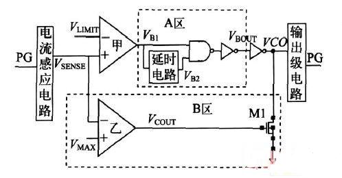 圖3 虛框B 區(qū)電路能解決屏蔽時間內大電流可能導致功率管瞬間燒毀的問題,當延遲時間內出現(xiàn)很大過流信號時,能及時關斷功率管,保證系統(tǒng)安全。關斷電路由比較器乙和NMOS 開關管M1 組成。