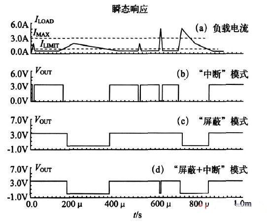 圖5 中(a)曲線表示負載電流幅值和作用時間的關系,ILIMIT 和IMAX 分別為限制電流和最大幅值電流。圖5 中(b)、(c)和(d)曲線分別為采用傳統(tǒng)“中斷”模式、“屏蔽”模式以及“屏蔽+ 中斷”模式過流保護電路后LDO 的輸出電壓波形。