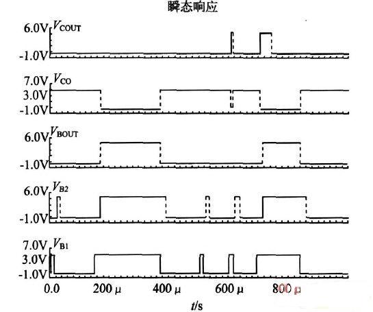 “屏蔽”模式的邏輯關系如圖4 所示,其中VB1和VCOUT 分別為比較器甲和乙的輸出信號,VB1 經過一個延遲時間后輸出信號為VB2,屏蔽電路輸出電壓為VBOUT,VCO為屏蔽電路的輸出端。VB1、VB2和VBOUT的波形反應了屏蔽電路的邏輯關系,只有當VB1 和VB2 同時為高電平,VBOUT 才為低電平,否則VBOUT 一直為高電平,因此屏蔽電路屏蔽了延遲時間內的脈沖信號,保持寬脈沖信號;VCOUT為使能端,只要VCOUT為高電平,VCO 立即變?yōu)榈碗娖健?/p>