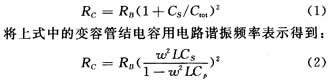 在圖1所示電路中,調諧電壓通過扼流電感和偏置電阻RB加到變容管上,串聯電容CS使交流電路閉合,同時把變容管的負極與并聯電感隔離開,從而使調諧電壓能正確加載。電路中還并聯了一個固定電容Cp。放在偏置電阻前的退耦電容容量很大,相當于交流接地,故在后續的討論中可不予考慮。對高頻交流信號而言,偏置電阻和串聯電容是并聯的。通過網絡變換將其變換到并聯諧振回路中,該等效并聯電阻RC為: