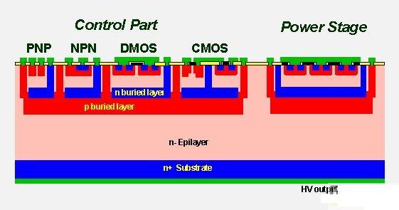 這個(gè)特性使共射-共基放大器結(jié)構(gòu)的開關(guān)性能比一個(gè)標(biāo)準(zhǔn)雙極晶體高出很多,可與一個(gè)場(chǎng)效應(yīng)MOS晶體管媲美。因此,我們說(shuō)這個(gè)器件沒(méi)有電荷貯存效應(yīng)。這項(xiàng)技術(shù)的控制部分是采用BCD(雙極-互補(bǔ)MOS-雙擴(kuò)散MOS)單元庫(kù)實(shí)現(xiàn)的。