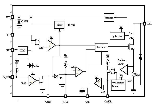 控制級(jí)和功率級(jí)都是由Vcc引腳供電,Vcc引腳通過(guò)一個(gè)電阻電容(R-C)網(wǎng)絡(luò)與直流總線相連。在啟動(dòng)階段,電容通過(guò)一個(gè)高阻值的電阻器充電,因此,只需幾百微安。由于功率雙極晶體貯存基極電流是在通過(guò)‘Vcc充電網(wǎng)絡(luò)’連接Vcc引腳的電容上恢復(fù)的,因此,在工作階段,器件是自己給自己供電。