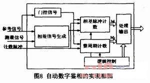 混頻電路的實現基于混頻器AD831。使用兩片AD831,分別用于參考信號與本振信號混頻及測量信號與本振信號混頻。混頻后使用芯片MAX274進行帶通濾波,得到混頻后的低頻正弦信號。然后通過基于MAX912的過零比較電路將正弦信號轉換為同相位差的方波信號,輸入到FPGA中進行鑒相。在FPGA中,利用多周期自動數字鑒相法,對相位差進行檢測。其實現框圖如圖8所示。
