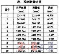 在實際測量中,利用組合測尺頻率先后進行兩次測量。第一次取主振信號頻率為52MHz,本振信號頻率為51.99MHz;第二次取主振信號頻率為51MHz,本振信號頻率為50.99MHz。對應于混頻后信號頻率為10kHz。FPGA中鑒相高速計數脈沖頻率為50MHz?;谝陨蠀?,對多段光纖進行測量。兩次測量的結果進行分析比較,可得到測量值。被測光纖的實際光程已由精密反射儀通過光學方法進行標定。測量結果如表1所示。