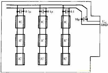 在單片機(jī)測控系統(tǒng)中使用了大量的數(shù)字IC,而每片數(shù)字IC本身都是一個(gè)脈沖干擾源,它們也會通過電源線相互干擾。解決辦法是在印制板電源進(jìn)線端并聯(lián)一只10UF~100UF鉭電容進(jìn)行電源退耦,同時(shí)在每個(gè)芯片的電源進(jìn)線端再并聯(lián)一只高頻、低分布的電感的陶瓷電容,容量一般取0.1UF,當(dāng)頻率超過15MHZ時(shí),可取0.01JF,電路如圖所示。退耦電容的引腳要盡量短。