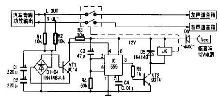 1.在接通音響電源的瞬間,因電容C3兩端電壓不能突變,可視為短路,則時基電路555的②、⑥腳電位高于2/3 Vcc,故555處于復位狀態,③腳輸出低電平,晶體管VT2截止,繼電器JK常開觸點不動作。同時+12 V電壓通過電阻R4向電容C3充電,延時約5s(秒鐘)后555的②、⑥腳電位降低至1/3Vcc,555被觸發置位,③腳由低電平變為高電平,晶體管VT2導通,繼電器JK得電,常閉觸點閉合,從而實現了延遲一段時間將揚聲器接入功放,徹底消除了開機時大電流對揚聲器的沖擊;