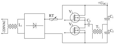 本系統開關電源采用負溫度系數電阻組成的軟啟動保護電路, 簡單實用, 工作可靠。如圖1, 220 V 交流電經線圈L1濾波共模干擾后, 整流產生約三百伏左右直流電壓, RT 電阻為負溫度系數熱敏電阻,型號為M02-7Ω。當電源合閘瞬間, 浪涌電流使得熱敏電阻發熱, 阻值迅速減小, 輸出直流電壓逐漸建立,可有效防止浪涌電流對電源電路的沖擊, 使得整個電源半橋變換電路穩定可靠。