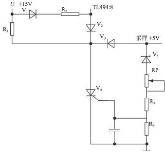 工作原理: 數控開關電源由輔助電源+ 15 V 提供給可控硅V4管陽極工作電壓, 實際輸出取樣電壓送至穩壓管V5 , 當超出保護電壓閾值+ 5. 5 V 時, 輸出電壓經穩壓管、電阻R3 、R4 分壓觸發可控硅V4 導通, 將輔助電源+ 15 V 通過電阻R1接地, 同時通過二極管V2切斷8 腳電源。調節RP 電位器, 可以對輸出電壓保護閾值點進行設置。