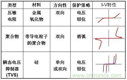 安森美半導體來自美國的ESD保護專家Robert Ashton博士說,一般而言,ESD保護元件的分類可以通過其保護策略與方向性來進行,主要包括壓敏電阻、聚合物和瞬態電壓抑 制器(TVS)等,如表1所示。在這幾種保護元件中,壓敏電阻在低電壓時,呈現出高電阻,其中的每個小型二極管兩端的電壓都相當低,同時電流也相當小;而在較高電壓時,其中的獨立二極管開始導通,同時壓敏電阻的電阻會下降。從表1中我們也可以看出壓敏電阻為雙向保護元件。而對于帶導電粒子的聚合物而言,在正常電壓下,這些材料擁有相當高的電阻,但當發生ESD沖擊時,導電粒子間的小間隙會成為突波音隙陣列,從而帶來低電阻路徑。