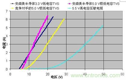 圖3的屏幕截圖就是這樣一個范例。從圖中可以看出,安森美半導體的TVS元件可以迅速將ESD應力降低,即從8 kV靜電電壓鉗位到5至6 V的水平;但壓敏電阻的曲線則下降得很慢,而且無法降到很低的水平。該曲線表明,TVS器件的恢復時間非常短,經過TVS器件泄漏到后面電路的能量也非常少,特別適合于便攜式設備的應用。