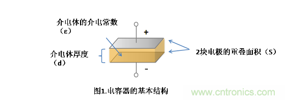 電容器用于儲(chǔ)存電荷,其最基本結(jié)構(gòu)如圖1所示,在2塊電極板中間夾著介電體。