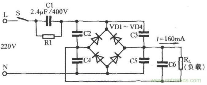 如圖是用電容器代替常用的變壓器,將市電220V降至整流器所需要的交流低電壓電路。在電路中主要由電容器C1降壓,耐壓值為400V;C1的電容量依據輸出電流確定。在220V/50Hz條件下,電容器C1的取值與輸出電流按下式估算: C=15I 式中:I為輸出電流,單位為A;C的單位為μF。 元件選擇:C1可用紙介金屬膜電容器或紙介油浸電容器,耐壓為400V。為了避免電源斷開C1上仍有電荷,所以在C1兩端跨接了一只1MΩ的泄放電阻R1。電容器C2、C3、C4、C5均為消除調制交流聲和其他高頻干擾而設置的。C6為濾波電容器,RL為負載電阻器。