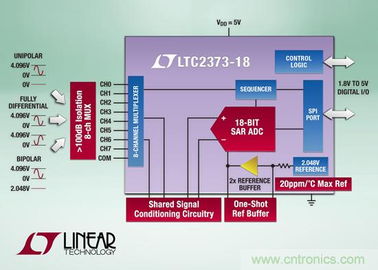 【導(dǎo)讀】近日,凌力爾特公司宣布推出具排序器的 18 位、1Msps、8 通道的逐次逼近寄存器 ADC LTC2373-18,該器件擁有卓越的 100dB SNR 性能。LTC2373-18 具可編程排序器,可存儲(chǔ)多達(dá) 16 個(gè)控制字,以配置多工器 (MUX) 和輸入范圍。