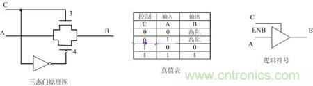 當控制端C為“0”時,3、4管都截止,輸入端A的電平狀況無法到達輸出端B,輸出端B呈現高電阻的狀態(tài),稱為“高阻態(tài)”。