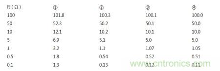 對測量結果的比較可以看出,對于100Ω的電阻,普通數(shù)字萬用表的測量相對誤差在2%左右,隨著電阻值變小,未經(jīng)過改進的數(shù)字電源萬用表的測量誤差越來越大,原因主要是饋線電阻的影響;經(jīng)過處理的數(shù)字表,測量5Ω電阻的相對誤差在2%以下,但受恒流源電流本身穩(wěn)定度的影響,②、③測量結果的準確度也不一樣;而饋線補償法測量誤差最小,不管饋線電阻大小如何,其測量0.1Ω的相對誤差都低于10%。